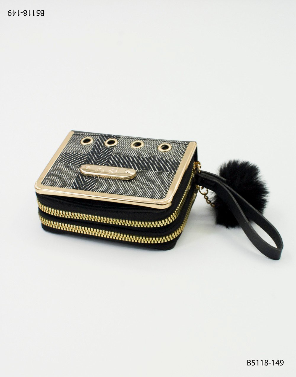 Billetera con doble cierre, pompon y detalles metálicos B5118